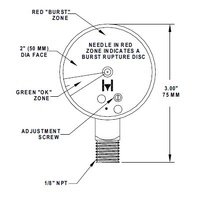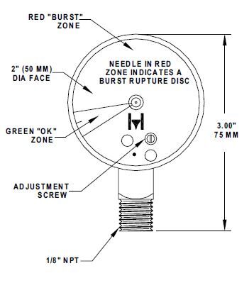The 2˝ (50 mm) diameter face has an easy-to-read “OK/burst” display. The green “OK” range is from 0 to 15 psig (0 to 1 bar). When normal pressure is less than 15 psig, the “Tell Tale” indicates the occurrence of pressure, especially useful on vacuum side of refrigeration systems. The ambient temperature range for these gauges is +32°F to +125°F (0°C to +52°C) and they have a safe