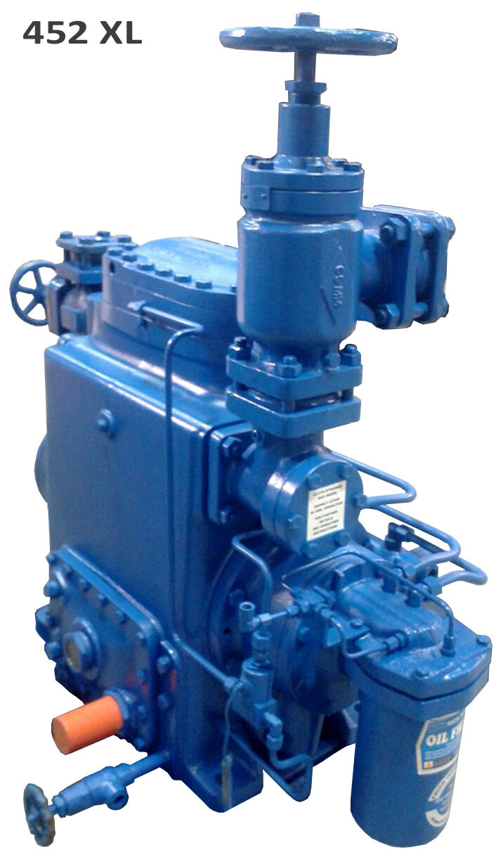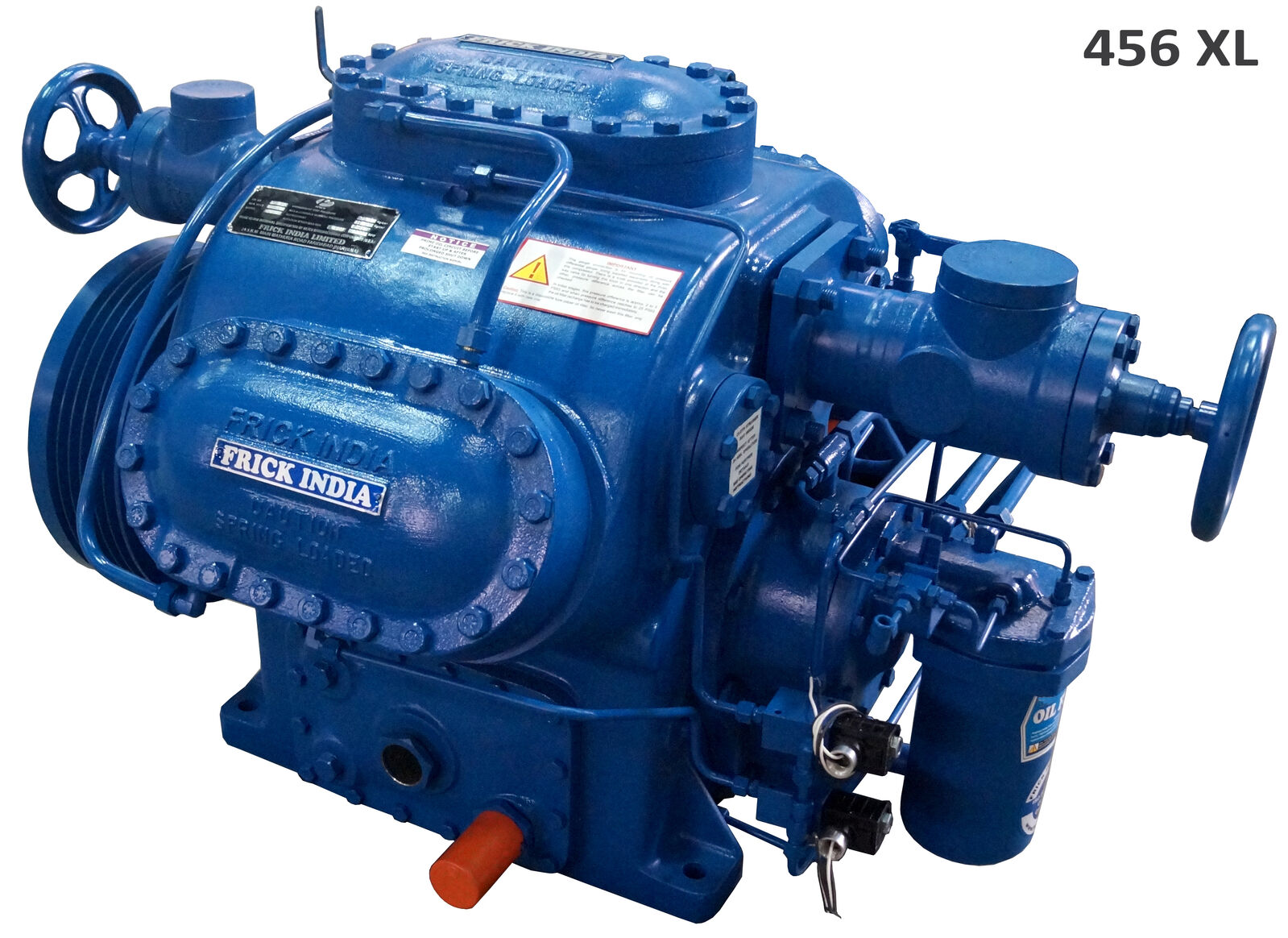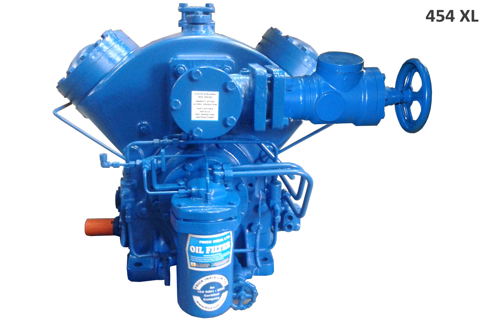 Frick India offers six models in the 450XL series of high-speed reciprocating compressors ranging from a nominal 2-cylinder machine all the way to the high end of scale-a nominal 8-cylinder model.  In between are the 4- & 6-cylinder mid-size units. All high-speed reciprocating compressors run at a maximum of 1200 RPM, and all are provided with built-in capacity reduction steps for economical