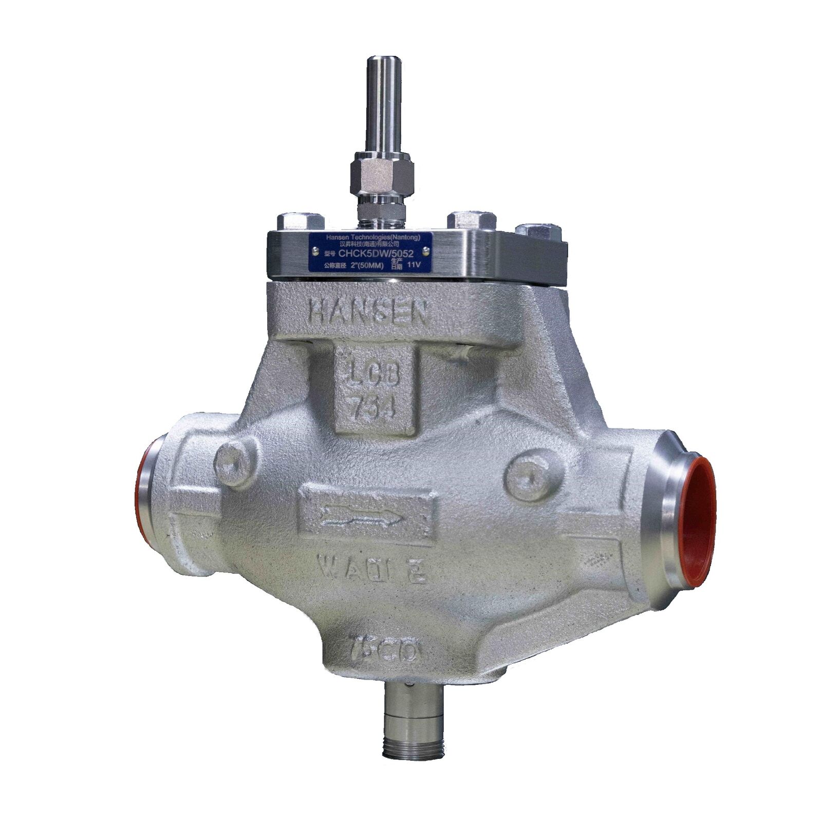 The HCK5D valve is ideally suited for positive closure of suction, liquid overfeed, and flooded evaporator gas return lines during defrost in low temperature applications. These valves can be installed in horizontal or vertical lines and are best installed on their sides for improved conveyance of liquid and oil. Because they are gas-powered to close, the valves operate reliably even under viscous oil conditions. They are suitable for Ammonia, Halocarbons, CO2 and other Hansen approved refrigerants and gases.